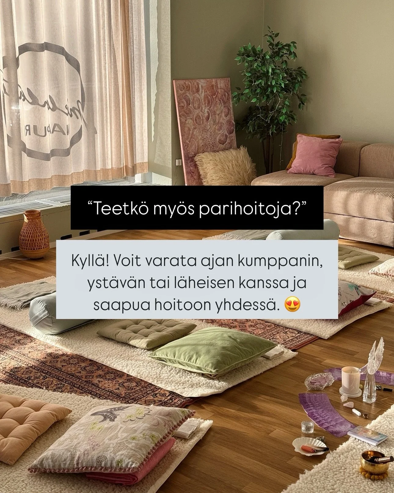 “Kiitos ihana Tia aivan maagisesta hoidosta! Tapasi hoitaa on aivan uniikki, lempeä, kaunis ja todella syvälle menevä. Hoito vaikutti monella tasolla; kehollisesti, sydämen&sielun tasolla sekä mieleen. Olo hoidon jälkeen oli rentoutunut, vapautunut ja silti todella vahva.